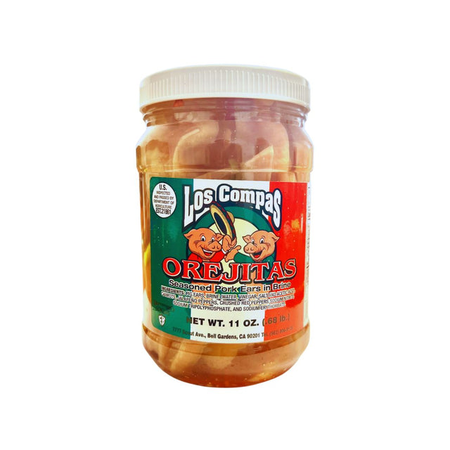 Savor the authentic taste of Mexico with Los Compas Seasoned Pork Ears in Brine, a traditional delicacy proudly crafted by Durango Foods. Made from tender, high-quality pork ears, this flavorful snack is seasoned to perfection and preserved in a zesty vinegar brine, delivering that classic tangy and savory taste Mexicans love.