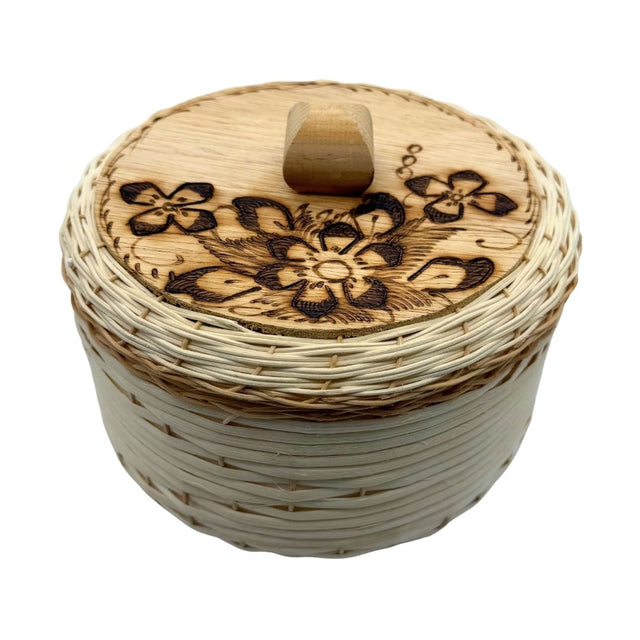 • Beautiful flower and petal design burned on the lid!